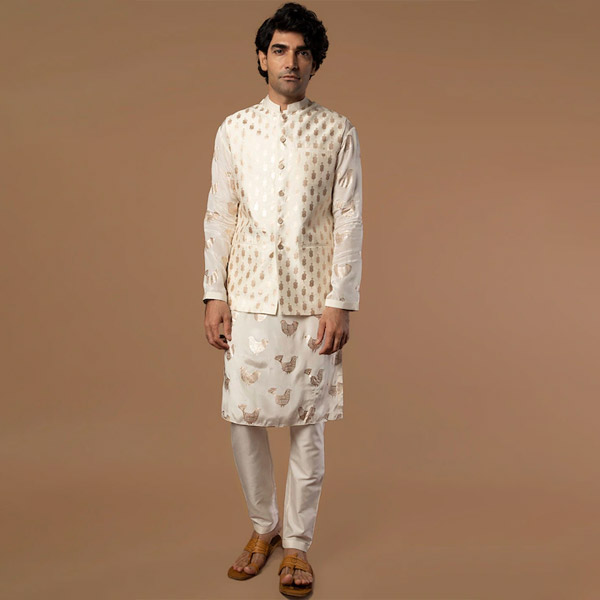White printed Kurta with Pyjamas & Nehru jacket Read more