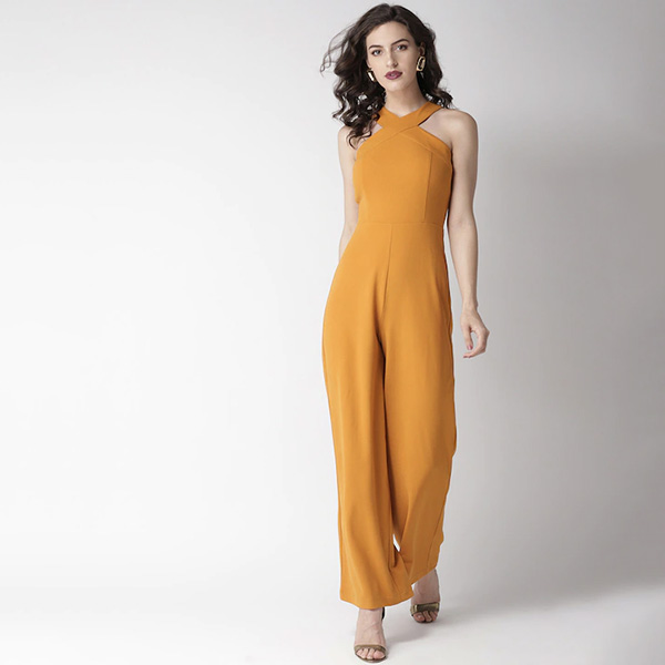 Mustard yellow solid basic jumpsuit, has a shoulder straps, sleeveless, concealed zip closure Read more