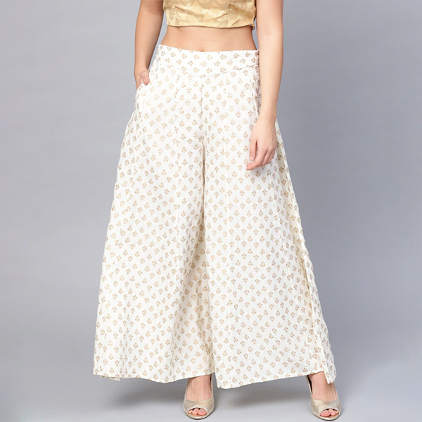 A pair of Off-white and golden printed woven flared Palazzos Read more